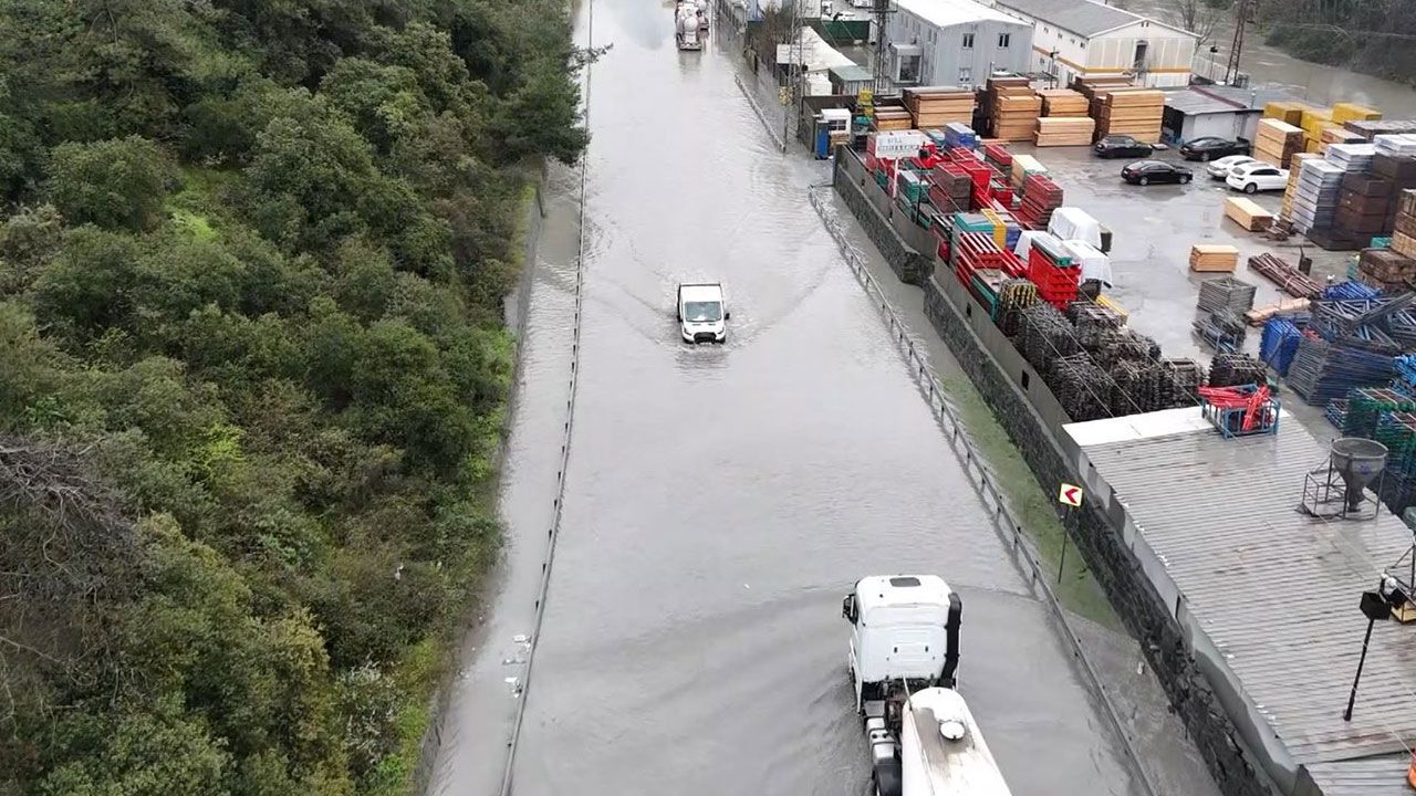 Hafriyat kamyonu ve tırların bile kontrollü olarak ilerlediği yol havadan görüntülendi. Görüntülerde yolun adeta göle döndüğü, tırların güçlükle ilerlediği bazı araçların da yol kenarında beklediği görülüyor.